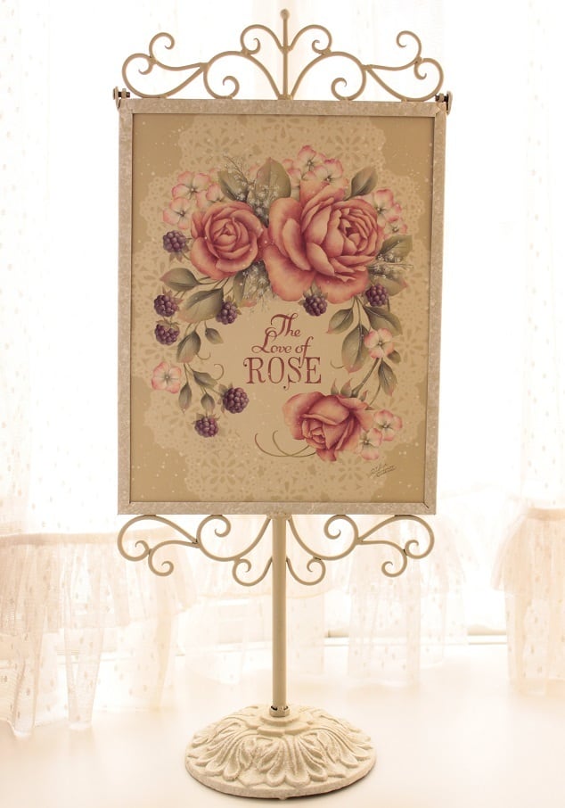 バラとベリーをアイアンスタンドに描く、上級者さん向きのトールペイントデザインパケット。モチーフはピンクローズ、ブラックベリー、カスミソウ。