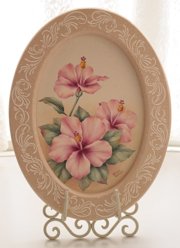 オイル絵の具でハイビスカスを描く、初~中級者さん向きのオイルペイントデザインパケット。2Lサイズ見本写真、図案、インストラクション、シェード&ハイライトのマップ図、完成のA4カラーコピー、色見本表カラーコピーが入っています。
