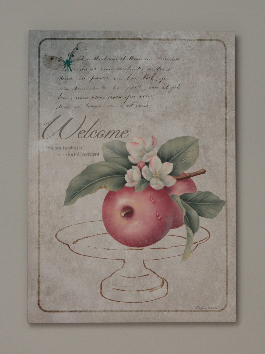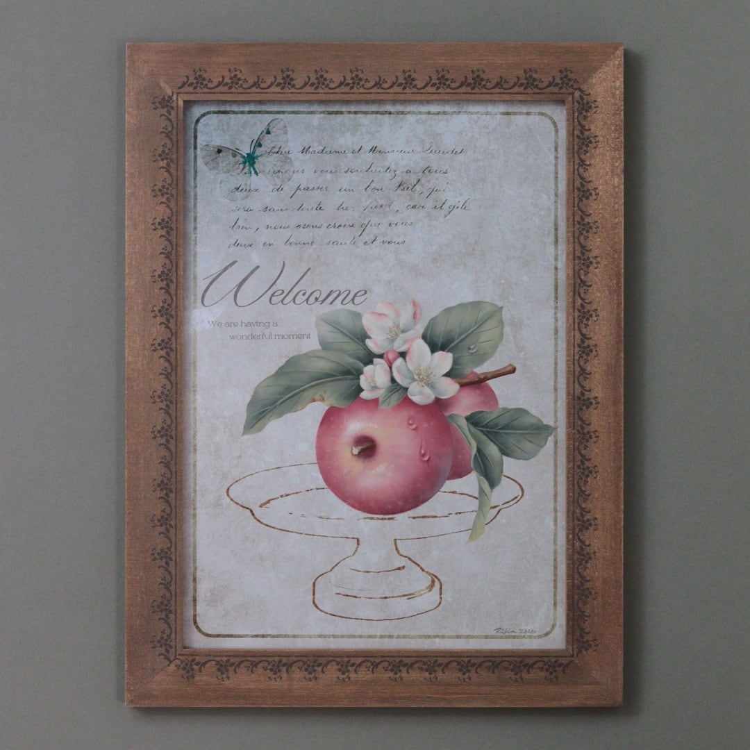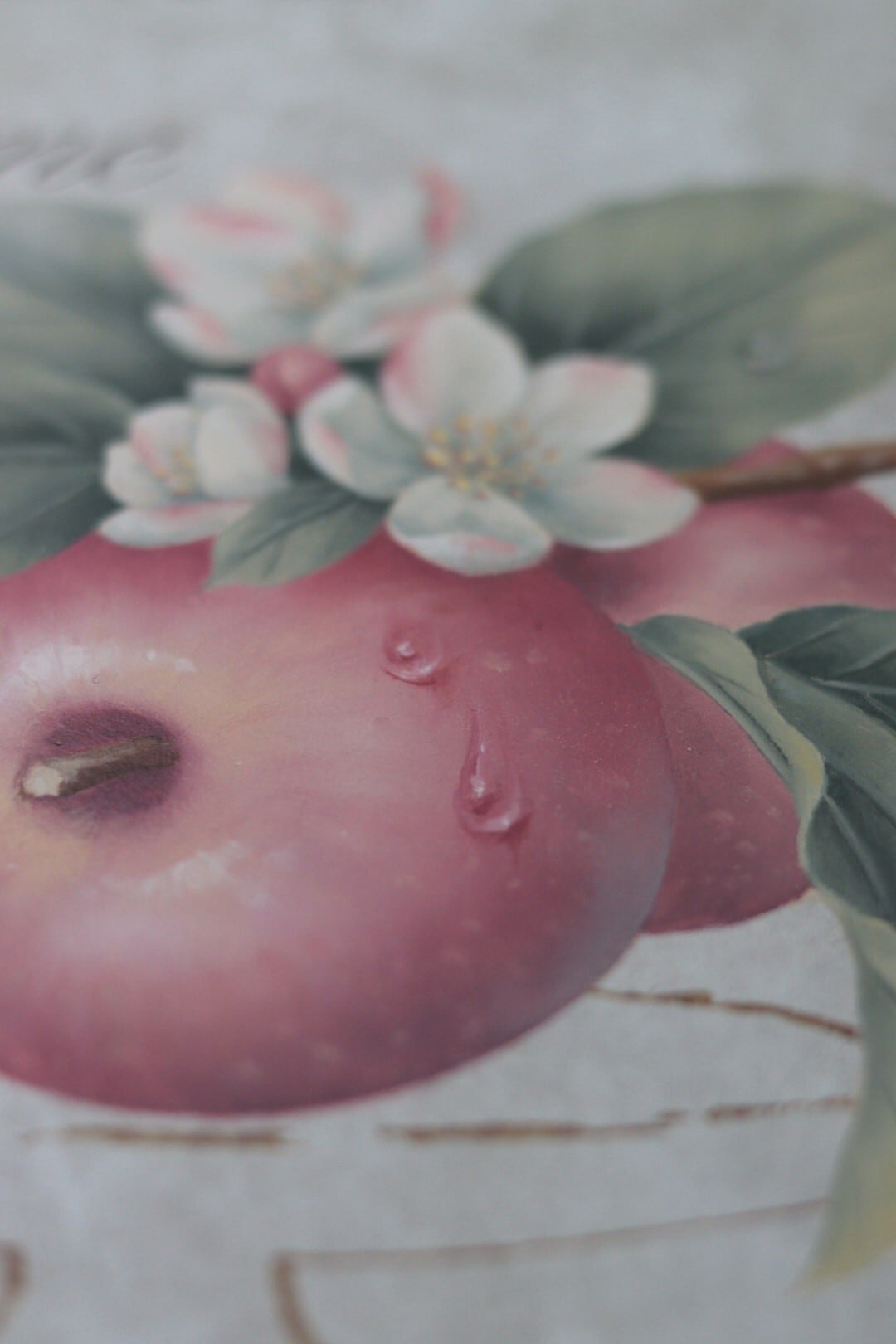 オイル絵の具でリンゴと雫を描く、中級さん向きのデザインパケット。A4サイズ見本カラーコピー、図案、インストラクション、シェード&ハイライトのマップ図、色見本表カラーコピー、A4のプリントパネル&家具職人さんが作ったフレーム1セット付き。